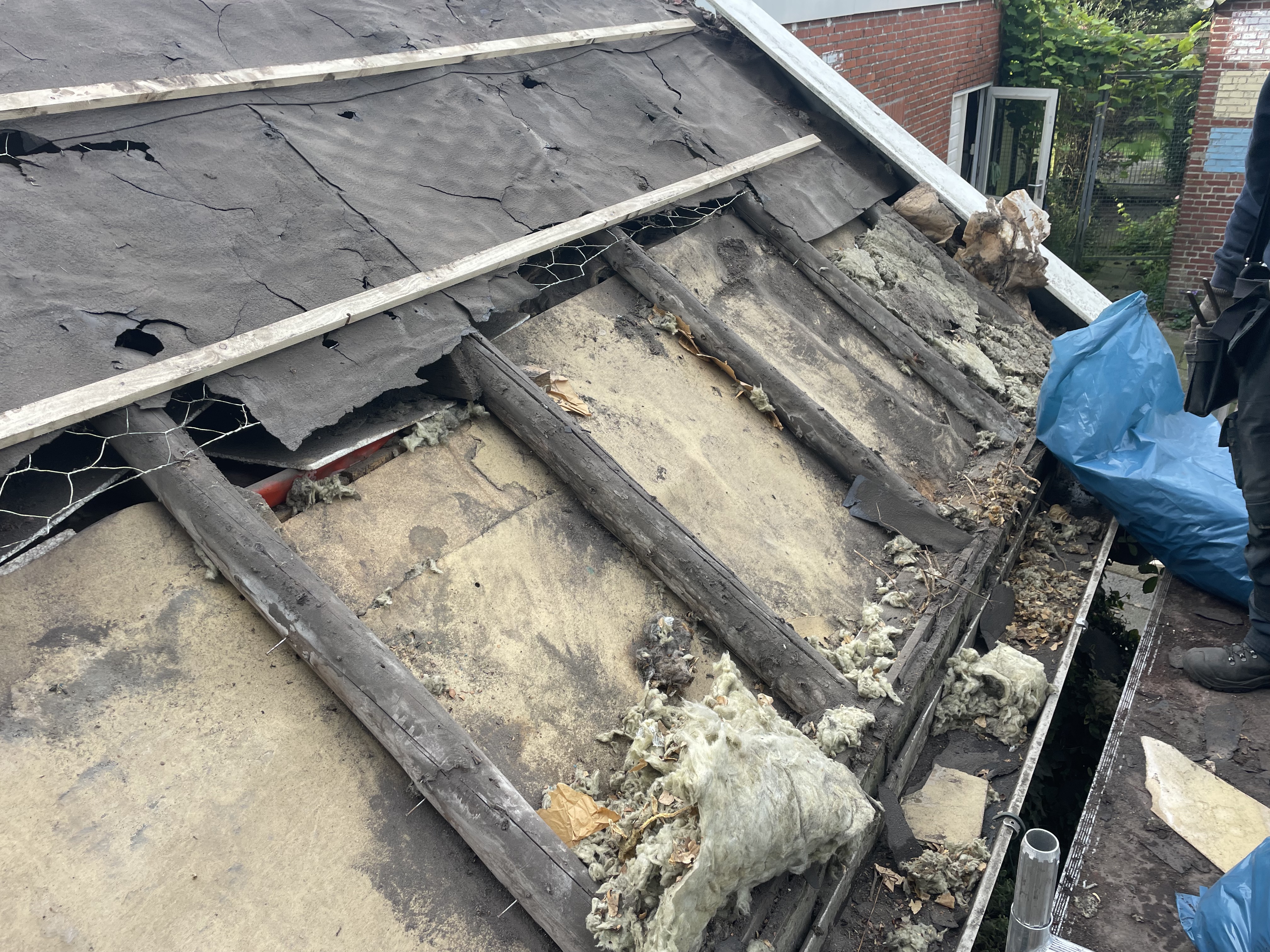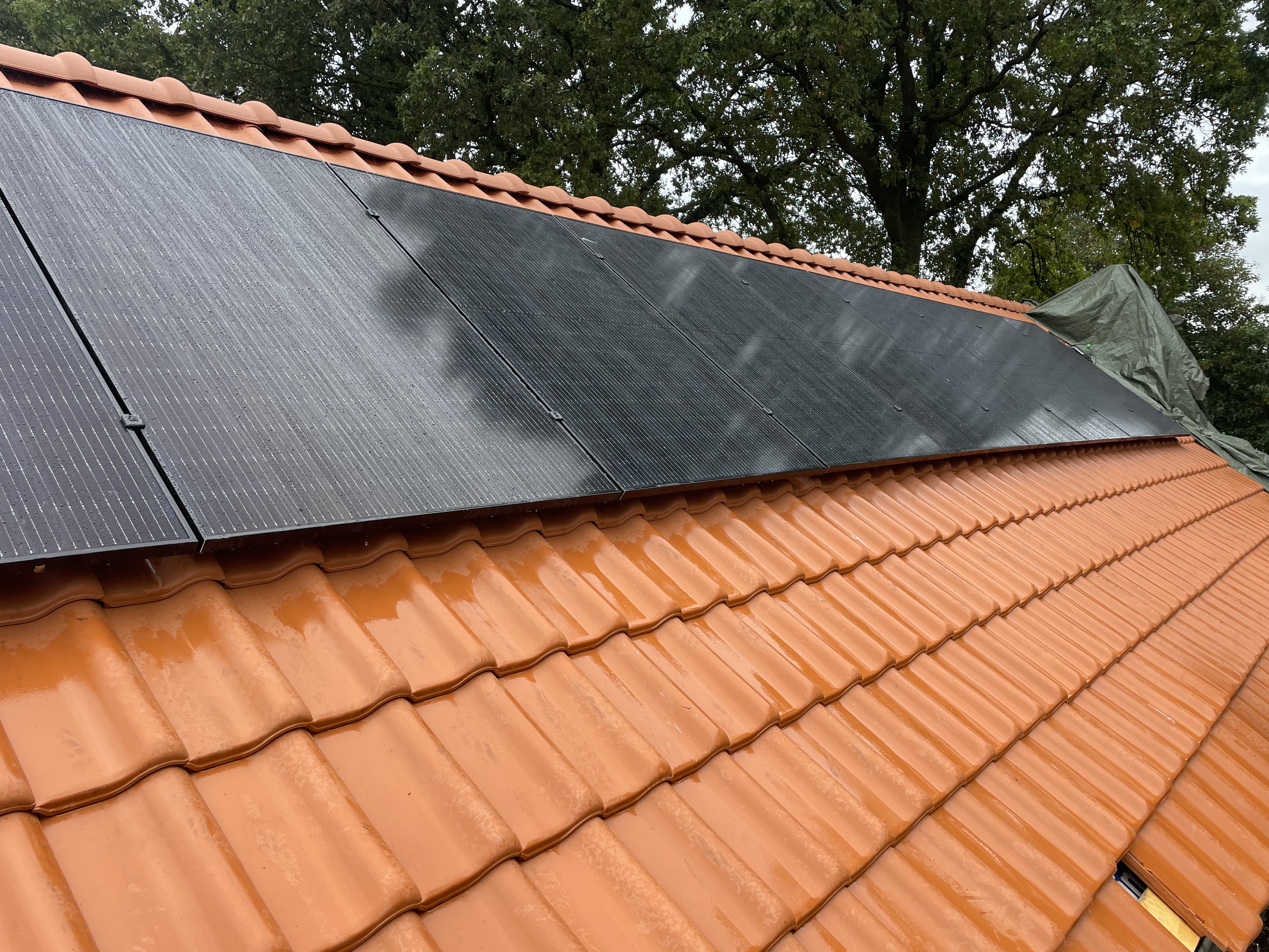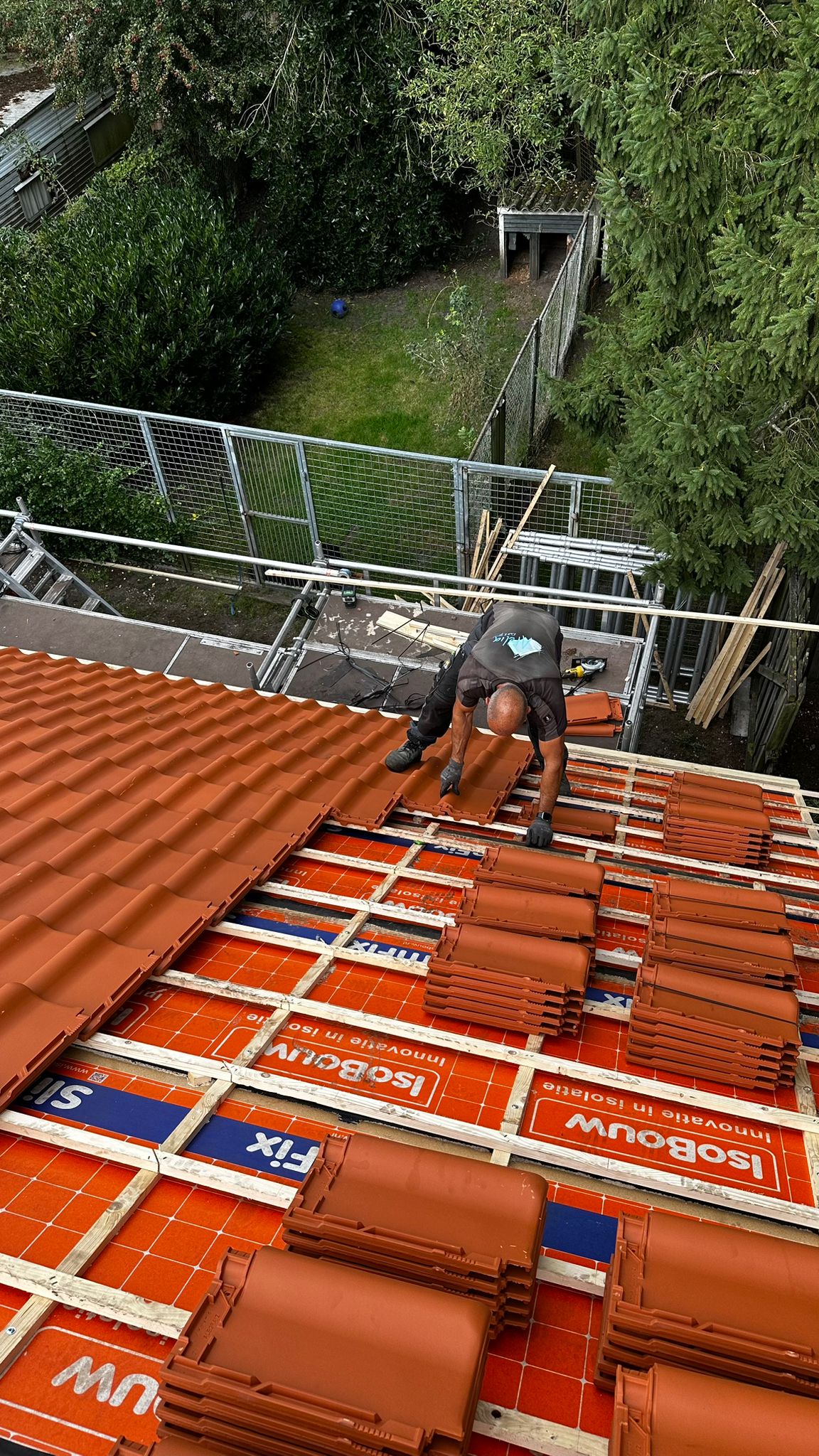 Vervolgens het hele dak geïsoleerd met Isobouw Slimfix spoor 4,5. en als dakpannen de natuurorde flachdachpan F10 van Nelskamp.