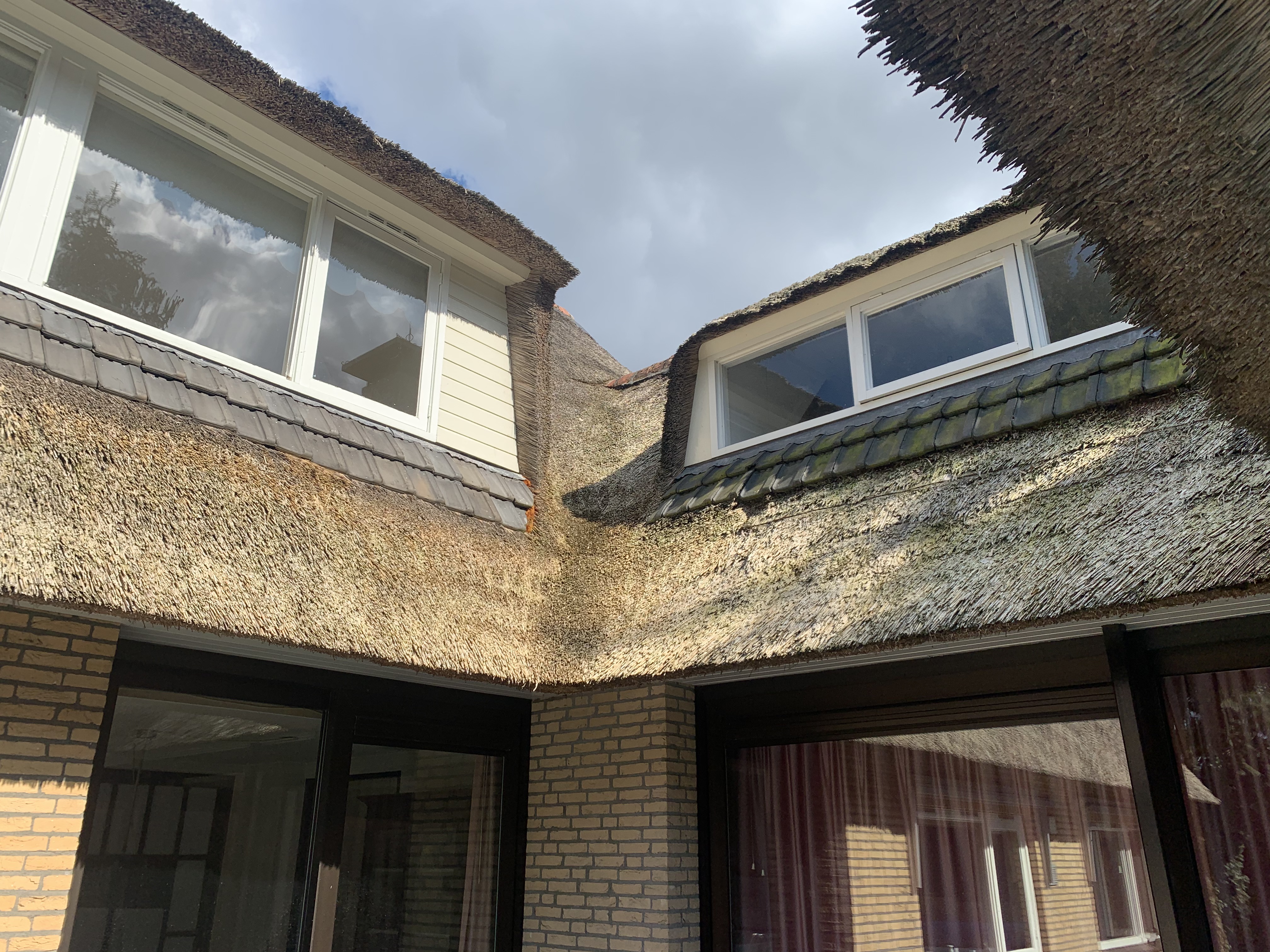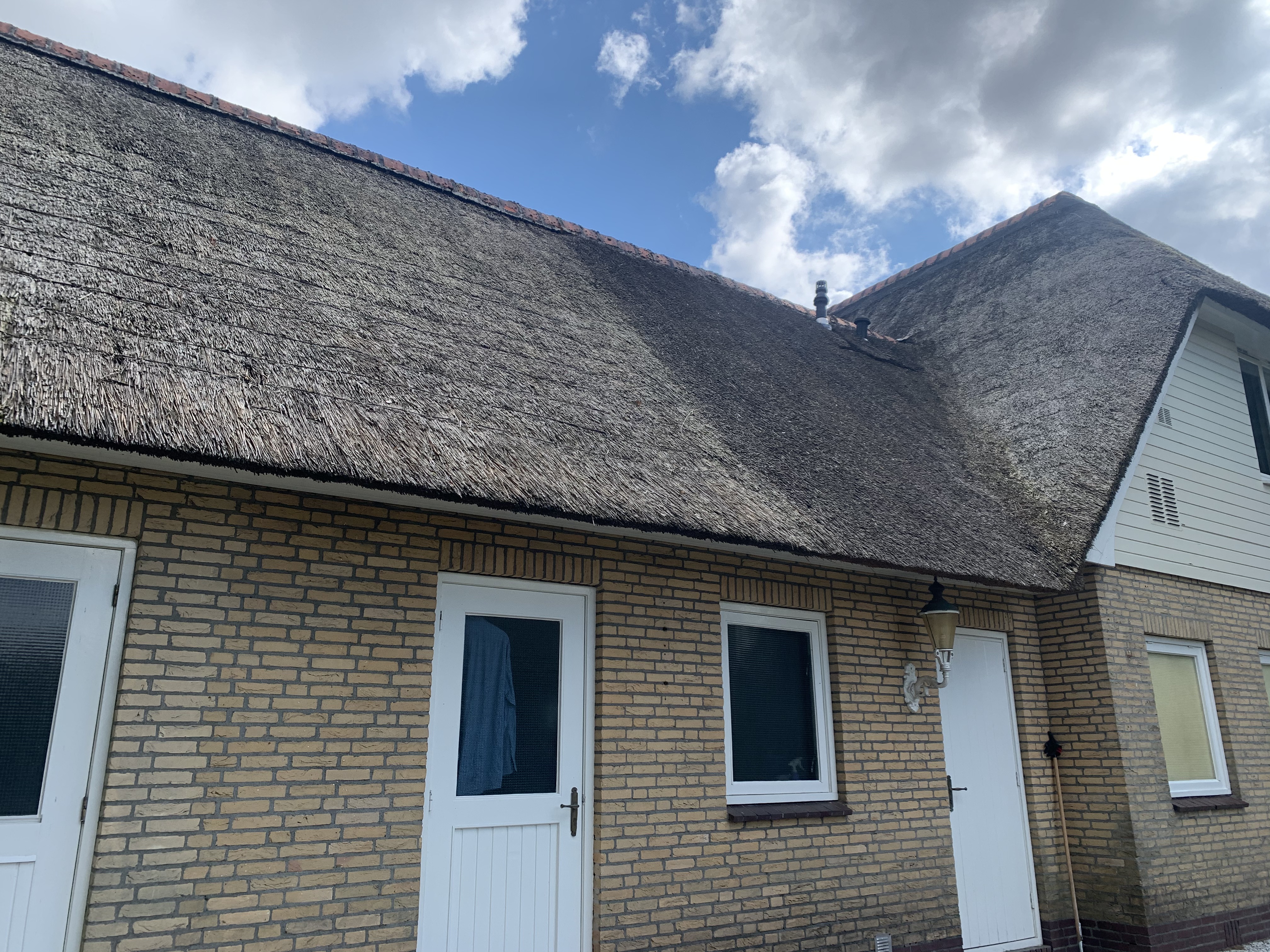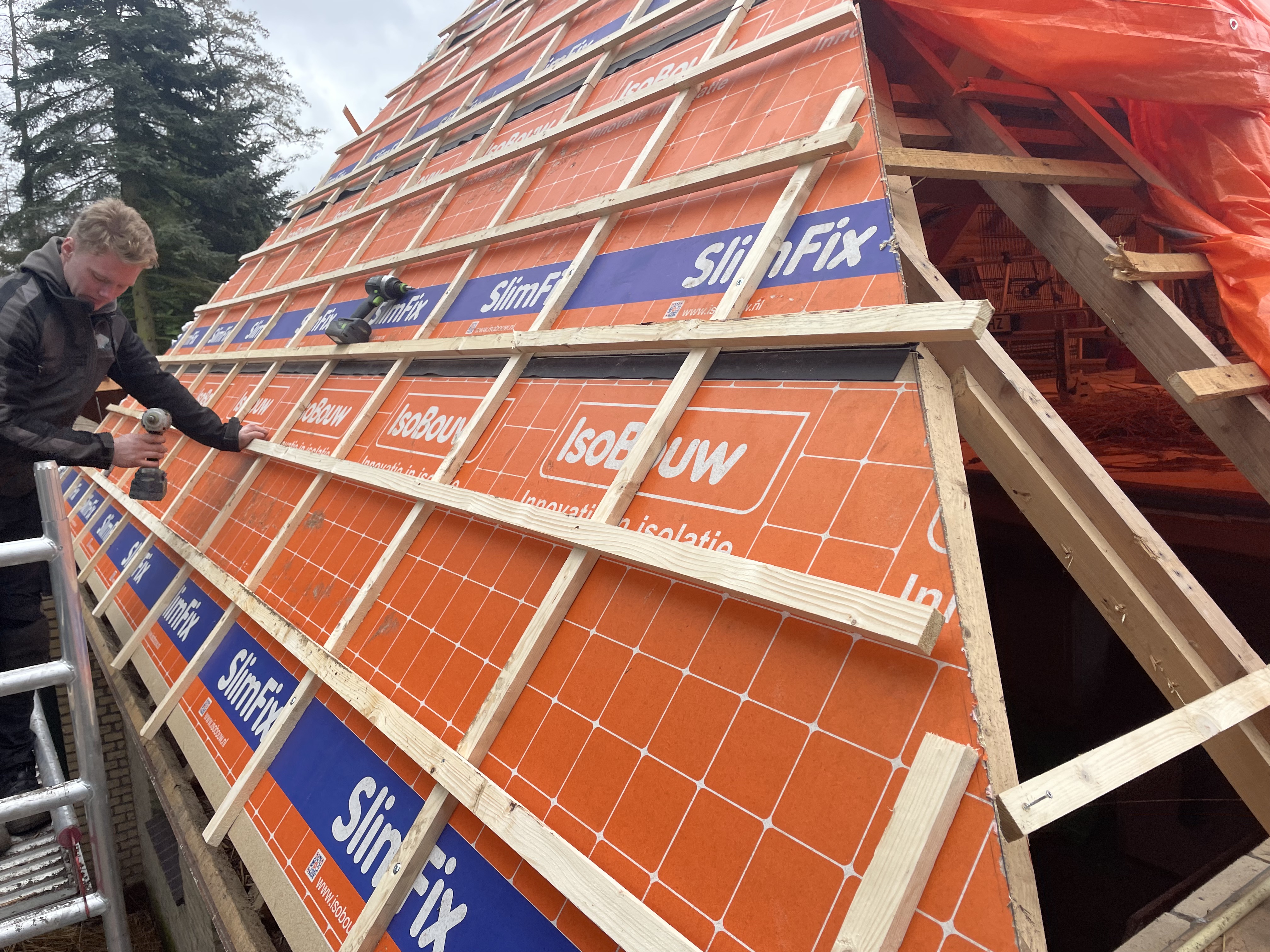 De eigenaar heeft ervoor gekozen het riet en asbest te laten saneren. Vervolgens is de sporenkap dak voorzien van Isobouw Slimfix spoor dakisolatieplaten. Alle dakkapellen zijn aangepast zodat er dakpannen op konden. De betimmering is van keralit sponningdelen en de dakgoten rondom zijn kunststof dakgoten van Polytech. Voor de dakpannen is gekozen voor Monier Nieuwe Hollander gitzwart verglaasd.