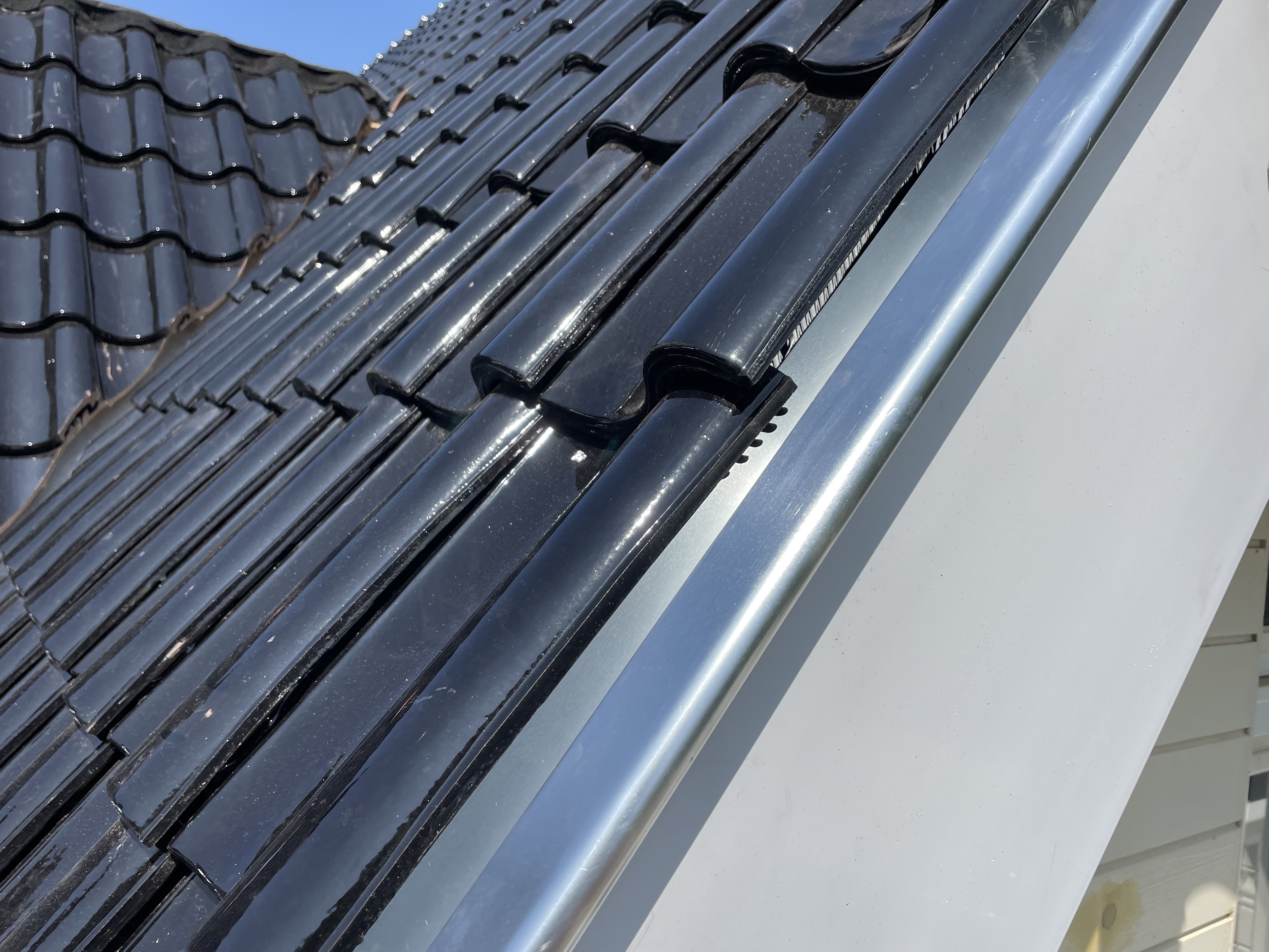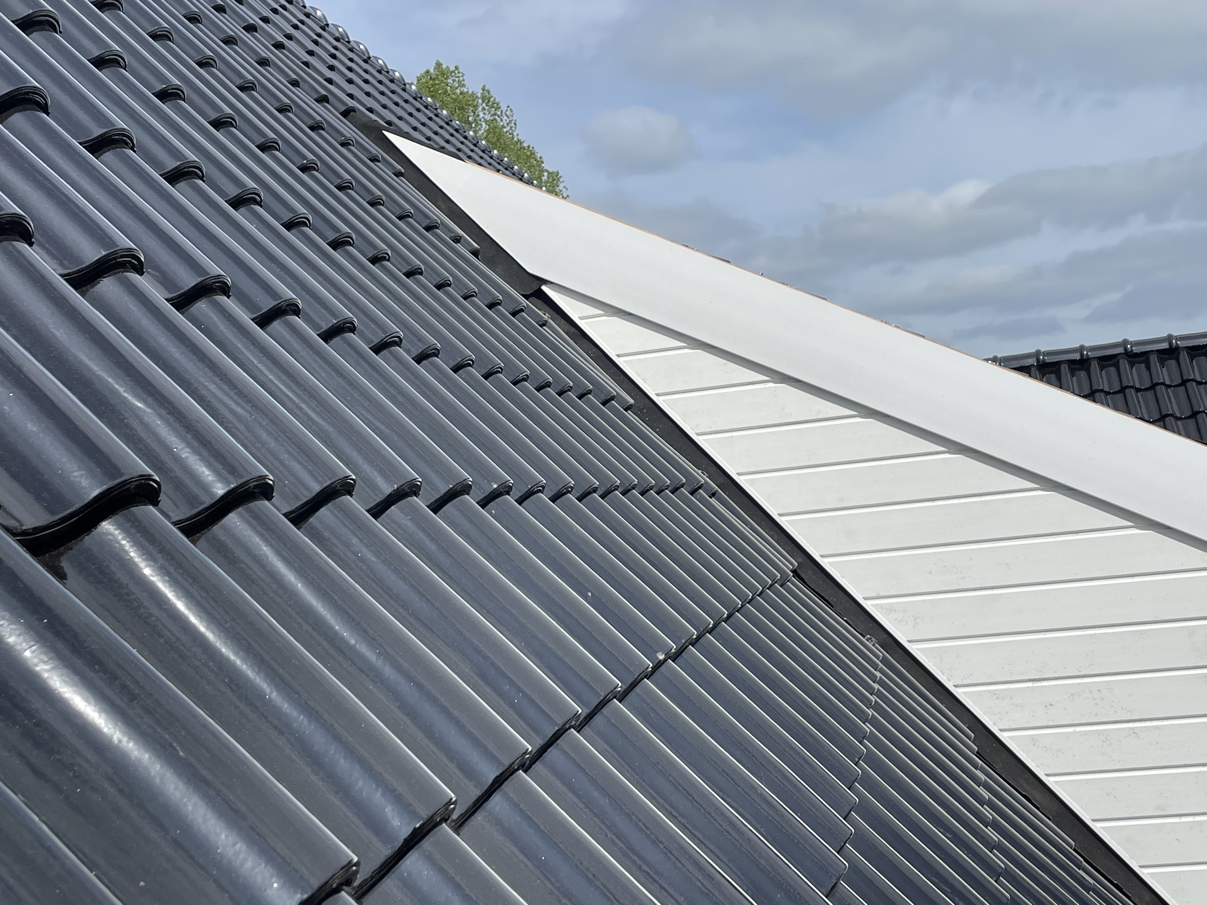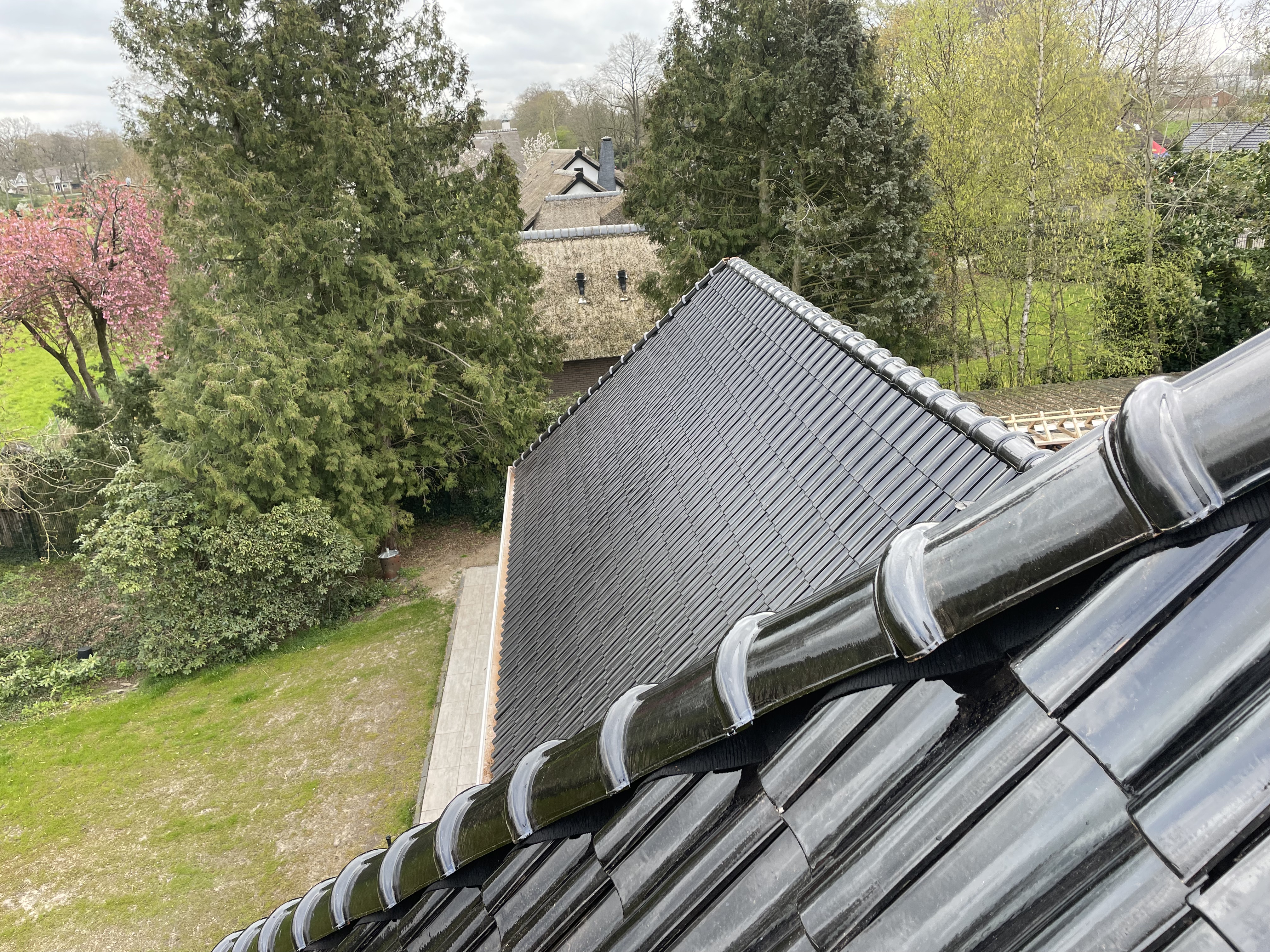 De eigenaar heeft ervoor gekozen het riet en asbest te laten saneren. Vervolgens is de sporenkap dak voorzien van Isobouw Slimfix spoor dakisolatieplaten. Alle dakkapellen zijn aangepast zodat er dakpannen op konden. De betimmering is van keralit sponningdelen en de dakgoten rondom zijn kunststof dakgoten van Polytech. Voor de dakpannen is gekozen voor Monier Nieuwe Hollander gitzwart verglaasd.